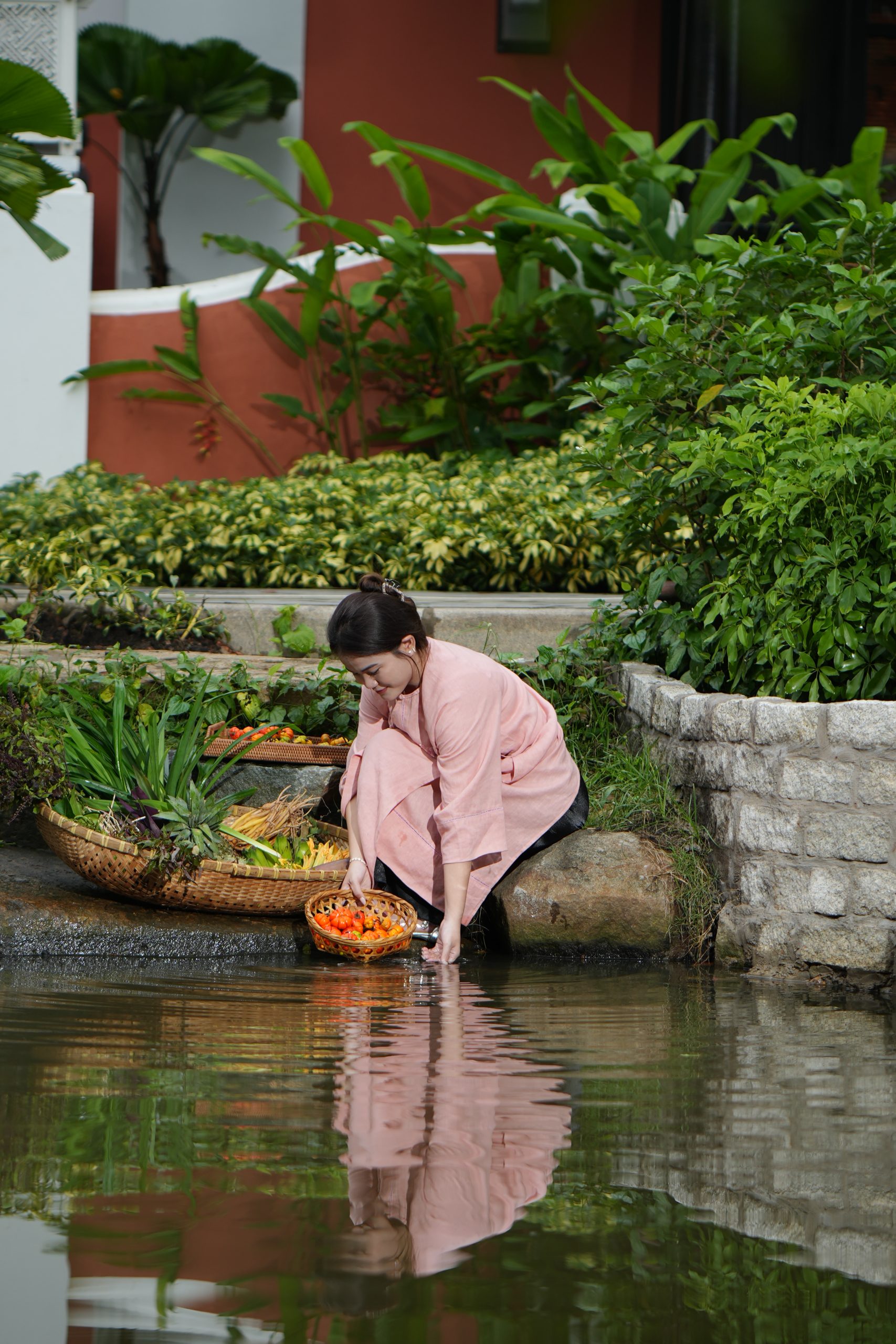 Không gian của Bến Thời Gian được chăm chút và kiến tạo bởi họa sĩ Hoài Hương, với lối kiến trúc mang đậm hồn Việt: mái ngói, hiên nhà, sân gạch, vườn và bến nước hòa cùng ánh sáng tự nhiên. Không chỉ là sự tái hiện hình thức, Bến Thời Gian được thiết kế để người bước vào có thể cảm nhận văn hóa qua từng nhịp thở, chất liệu bao quanh, tựa như đang bước vào không gian phủ đệ của một thế gia vọng tộc.