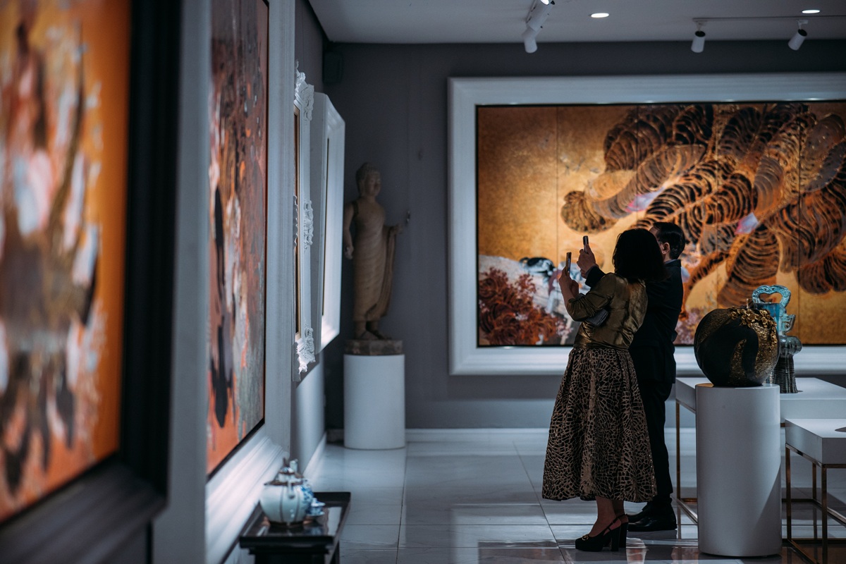 Họa sĩ Hoài Hương đặc biệt mê đắm với chất liệu sơn mài—một loại hình nghệ thuật truyền thống, giúp ông tạo nên những không gian “thuần Việt” đầy mỹ cảm. Với Nguyễn Hoài Hương, sơn mài không chỉ là chất liệu; nó giống như âm nhạc, nhưng là hòa âm của một dàn hợp xướng đa sắc.